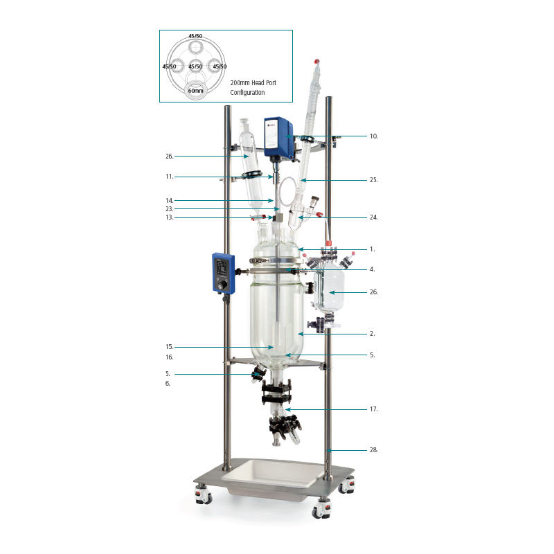 JRS-1503-02 | 20L标准中试反应釜系统,套装包括玻璃单元,高扭矩分体搅拌器和整体支架 |