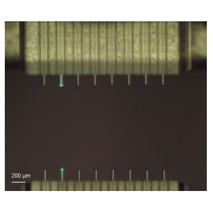 例如,可以应用于将自由曲面微纳光学组件直接打印到芯片上,从而连接多根光纤到一个芯片上。为了达到这个目的,必须将光收集起来,平行于芯片表面重新定向然后传输到窄波导中。而Nanoscribe公司基于双光子聚合原理的无掩模光刻系统拥有高设计自由度的特点,可以够轻松实现收集光束并传输到波导中。系统配备的高分辨率处理镜头和打印系统的编程接口可以实现耦合结构与波导的自动对准,且对准精度可达到100 nm。